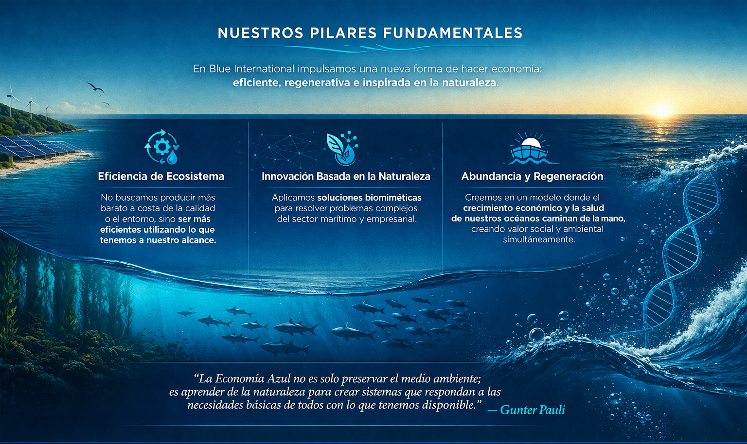 "Desde nuestra sede Central en Barcelona y Cádiz en España, y nuestras bases operativas en Argentina, Panamá, Brasil, Uruguay y Dubai, hemos creado este ecosistema para que la Economía Azul deje de ser una teoría y se convierta en una realidad rentable, segura y equitativa. Los invitamos a formar parte de esta transformación global."